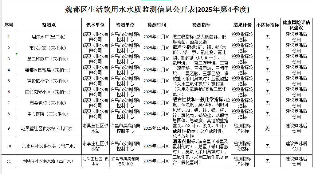 现将我区2025年第4季度生活饮用水质监测信息公示如下: