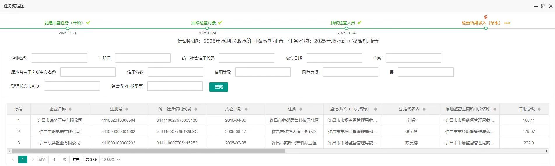 2025年,魏都区水利局随机抽调3名水行政执法人员,随机对所管理的取用水企业抽取3家(许昌市瑞华五金有限公司、许昌宇阳电器有限公司、许昌东谷塑业有限公司)进行监督检查,上述检查企业均按照规定规范取用下水,无违规之处。