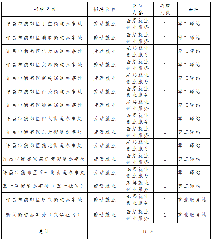 为认真贯彻落实就业援助政策,全面推动全国公共就业创业服务示范城市创建工作,有效促进就业困难人员就业,按照《中华人民共和国就业促进法》《河南省就业促进条例》《河南省公益性岗位管理办法》《河南省就业补助资金管理办法》等文件要求,经魏都区人力资源和社会保障局研究同意,由魏都区就业创业服务中心联合用人单位组织本次招聘活动,本次招聘公益性岗位人员用于13个零工驿站和2个就业服务站,现将有关事项公告如下: