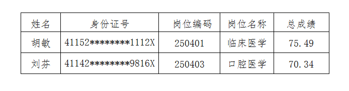按照《2025年魏都区特招医学院校毕业生和全科医生特设岗位招聘公告》要求,因体检对象放弃体检,出现招聘岗位缺额,在同岗位应聘人员中,按考试总成绩从高分到低分依次等额递补。递补名单如下: